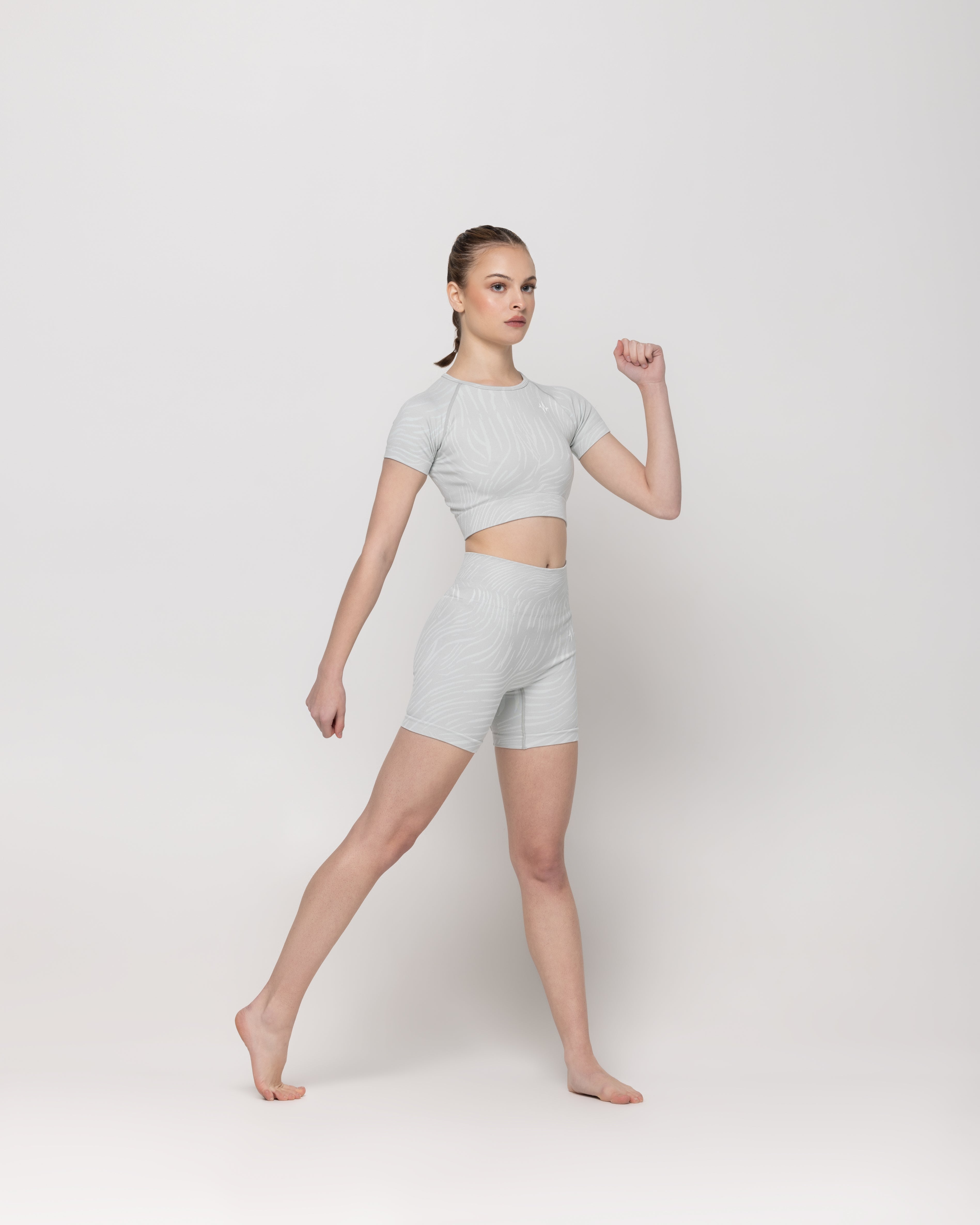 One set, four ways to style! This endlessly versatile Power Strike fit is featured with zebra-inspired abstract print in a monochromatic design for a subtle yet visually striking look. It is composed of ultra-stretchy fabric that adapts to your every motion, and comes with a sports bra, crop top, high-waisted leggings and shorts, allowing you to experiment with different looks.